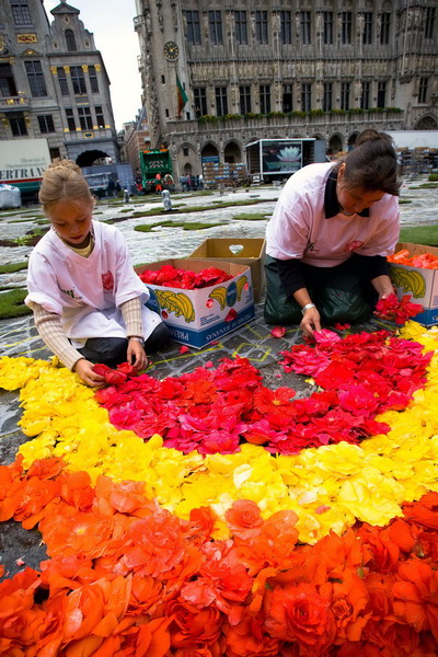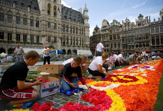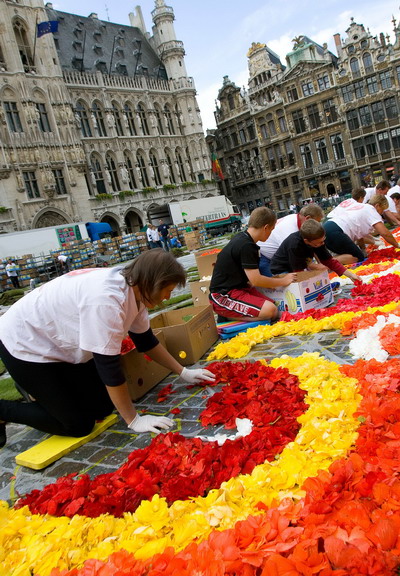 8月14日,在位于比利時首都布魯塞爾市中心的大廣場上,人們跟園藝工人一起將花瓣鋪在鵝卵石地面上,組成巨大的鮮花地毯。