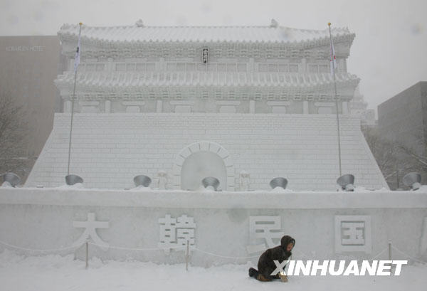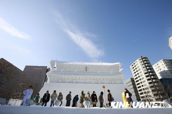 2月8日,在日本北海道札幌市舉行的第60屆札幌冰雪節(jié)上,游人從以韓國(guó)崇禮門為原型制作的雪雕旁走過。該雪雕長(zhǎng)20米,寬27米,高15米。韓國(guó)崇禮門(亦稱南大門)是首爾歷史最悠久的建筑,1962年被韓國(guó)政府定為一號(hào)國(guó)寶。崇禮門在2008年2月發(fā)生的一場(chǎng)大火中被焚燒殆盡,計(jì)劃在2013年復(fù)原。
