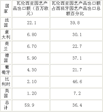 在瓦倫西亞有兩種截然不同的觀賞植物生產體系。南部地區主要生產大規格景觀苗木,北部地區是傳統盆栽植物生產區。在瓦倫西亞,有超過500個苗圃,其中390個生產觀賞植物,其余從事針樹和果樹生產。所有類型苗圃的總產值為2.1億歐元,生產植物產品約1.2億株,涉及各個種類。該地區生產的園藝產品在歐洲非常受歡迎,占據整個西班牙觀賞植物總產量的34%,而且一直保持良好的出口業績。