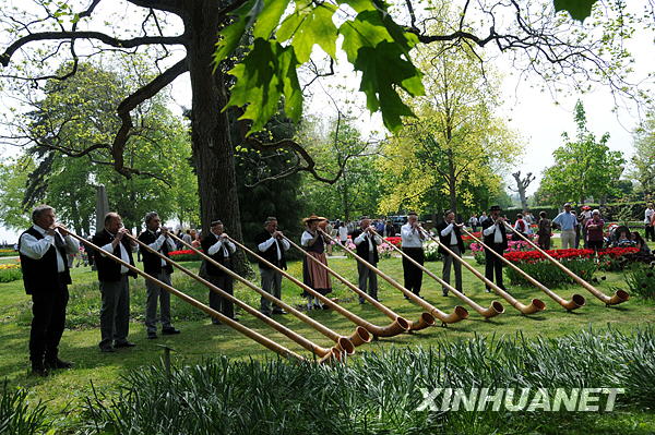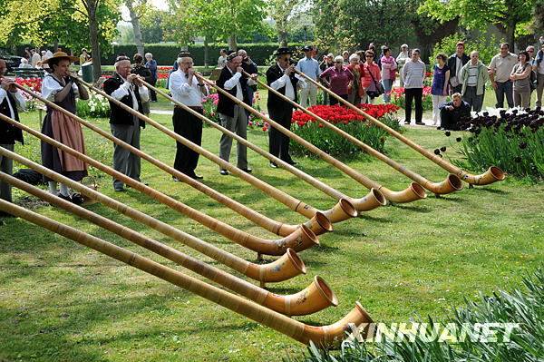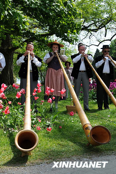 這是在瑞士莫爾日市舉辦的郁金香節上進行的阿爾卑斯長號表演(2009年5月3日攝)新華社記者楊京德