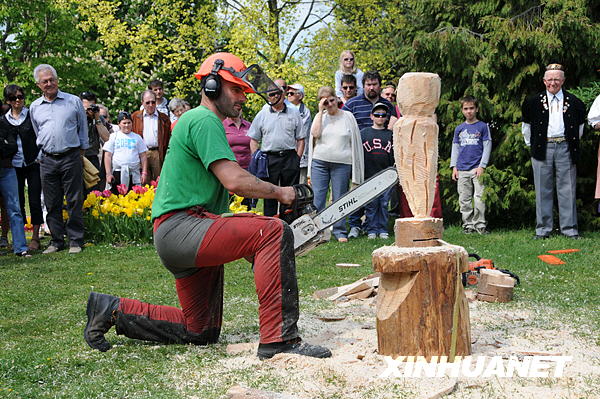 5月3日,游人在瑞士莫爾日舉辦的郁金香節上欣賞電鋸雕刻表演。新華社記者楊京德