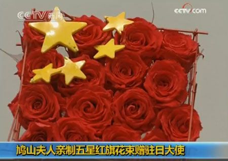 鳩山夫人親制五星紅旗花束贈送中國駐日大使(CCTV新聞頻道電視截圖)