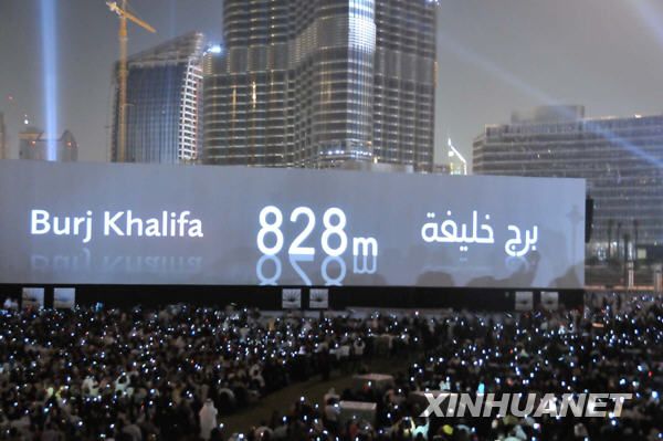 1月4日,在阿拉伯聯(lián)合酋長(zhǎng)國(guó)迪拜舉行的“哈利法塔”(前稱“迪拜塔”)落成典禮上,大屏幕上顯示出樓高828米字樣。阿聯(lián)酋當(dāng)晚為高達(dá)828米的“迪拜塔”舉行盛大落成典禮,并以阿聯(lián)酋總統(tǒng)、阿布扎比酋長(zhǎng)謝赫哈利法·本·扎耶德·阿勒納哈揚(yáng)的名字將其命名為“哈利法塔”。新華社記者安江攝