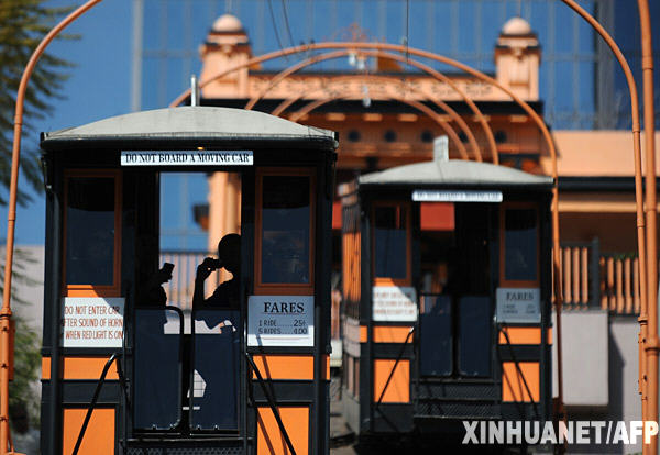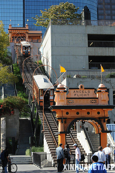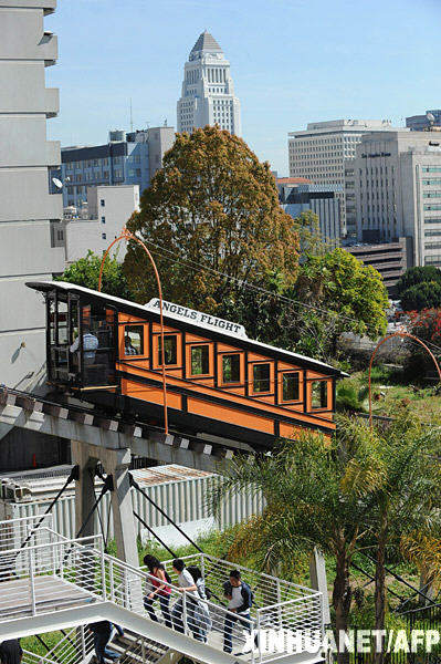 3月15日,幾名游客從洛杉磯著名景觀——天使登山纜車下走過。具有109年歷史的洛杉磯著名景觀——天使登山纜車在中斷運營9年后15日起重新開始運送旅客。2001年,纜車的一個座箱在運營過程中失控滑到坡下,撞到后面另一個座箱,導致一名乘客被撞死,7人受傷。經營者被迫停業整頓。在改進了安全裝置之后,有關部門批準該業務重新恢復。