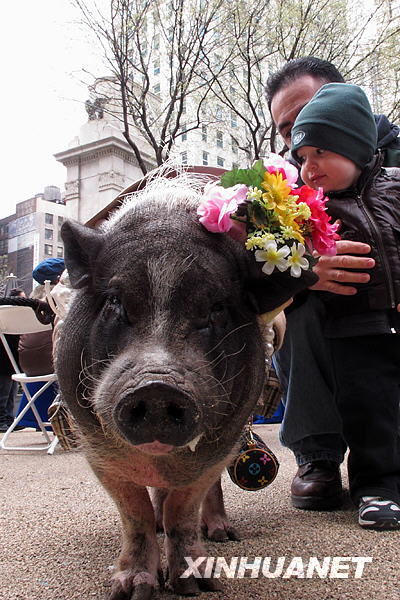 3月28日,在美國紐約曼哈頓的梅西百貨商場外,一名兒童和參加梅西百貨花卉展寵物秀的寵物豬玩耍。新華社發(吳凱翔攝)
