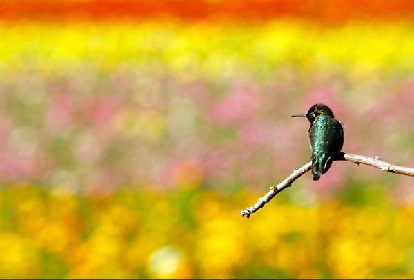 3月10日,美國加利福尼亞州卡爾斯巴德的花田里,一只蜂鳥棲息在樹枝上,遠處是近50畝盛開的特科洛特毛茛花。