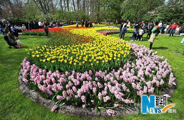 4月24日,游客在荷蘭中部城市利瑟附近的庫肯霍夫花園欣賞郁金香、風信子等花卉。庫肯霍夫花園是世界上最大的郁金香花園,種植有100多個品種的450萬株郁金香。隨著天氣逐漸變暖,郁金香和園內其他花卉競相開放,吸引了數以萬計的游客前來賞花踏春。新華社記者武巍攝