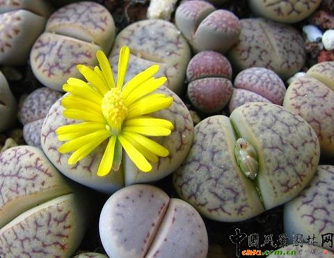 生石花(Lithops pseudotruncatella)是南非著名的多肉植物之一,尤其值得一提。生石花形如彩石,色彩豐富,嬌小玲班,享有“有生命的石頭”的美稱。生石花為番杏科生石花屬植物,3—4年生的生石花秋季從對生的中間縫隙中開出黃、白、紅、粉、紫等各色花朵。