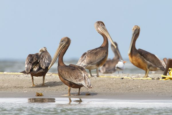 一群滿身油污的褐鵜鶘站在浣熊島上的一處水坑邊。作為路易斯安那州的州鳥,褐鵜鶘剛剛在2009年末才從美國瀕危物種名單上刪除。生物學家馬克-丹茲科爾在一份新聞稿中表示,墨西哥灣漏油對浣熊島上鳥類棲息地的災難性破壞是至今他在墨西哥灣看到的所有影響中最惡劣的。