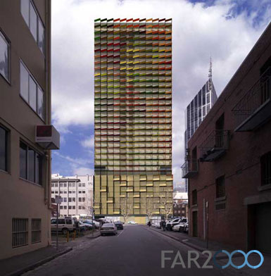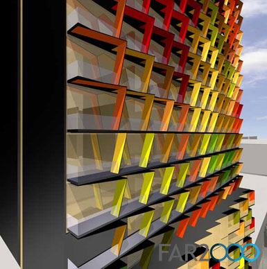 這是一座高質量的住宅樓,主要滿足商務區專業人士和學者的需求。奇特的遮陽板既成為一個標志,又成為住戶遮陽和保證私密性的工具。