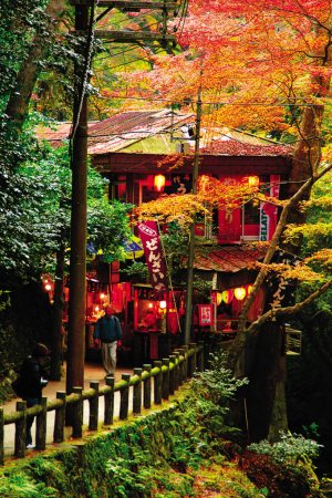 京都嵐山也是賞紅葉的著名勝地,沿山路攀登而上,經過一座小橋,來到神護寺,從寺內遠眺清瀧川峽谷與丹霞白堤,紅葉繽紛,層層疊疊。沿著山路,穿越白云橋前往高山寺,沿途有古老的茶園歇腳,寺中也提供上好的茶水。這里森林幽靜,紅、黃、綠不同色彩的植物為寺院增添秋的氣息。