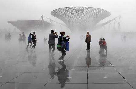 游客在世博園景觀區噴出的水霧中穿行。早報記者 王炬亮 圖