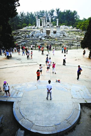 (采用“C羅式劈腿站立法”的)游客所立之處原為皇帝在圓明園觀看水法的席位。噴泉全部開放時(shí),“聲聞里許”,近處談話時(shí)需要借助手勢(shì)。水聲滔滔、水霧氤氳、平日里拉著長(zhǎng)臉的皇帝也會(huì)隨之手舞足蹈……