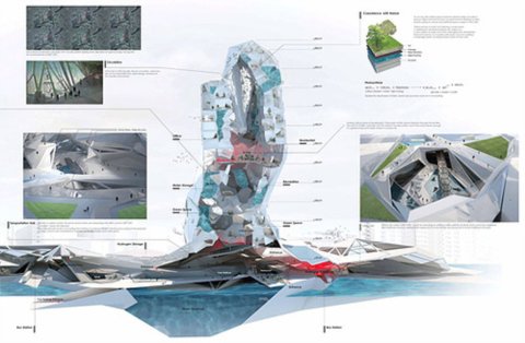 基于各種理論,摩天樓崇拜是地球人的本能,世界各地的城市表達自身能量值的主要方式就是蓋高樓。拿我們國家來說,當前已有高層建筑10萬幢,其中100米以上的超高層建筑1154幢(出處)。國內各地爭建第一高樓,國際高樓排行榜亦常換常新。最近位于紐約的國際建筑論壇 eVolo 舉辦了全球摩天樓設計大賽,出發點是探索摩天樓的發展趨勢。既然是純實驗性的比賽,對場地、建筑高度、外形和技術指標沒有任何規定,參賽建筑師有無限的想象空間,所以結果可想而知。 在大師柯布西耶曾經構想的“光明城市”模型里,大城市的基本要素是高層建筑、快速交通和大片綠地;而本次 eVolo 09 大賽則深入探索了在有限的城市空間里垂直發展的各種可能,從這個角度看它的意義非常重大。看到以下的獲獎作品你或許難以接受覺得匪夷所思,但沒準未來的城市真有可能是這樣的。 第一名:美國 Kyu Ho Chun/Kenta Fukunishi/Jae Young Lee ![]() ![]() ![]()