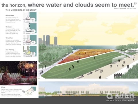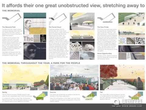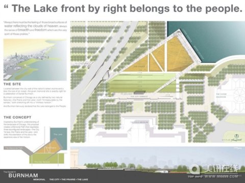 ![]() ![]() ![]() 三等獎得主:Sasaki Associates,Inc. “我們的靈感來自于Burnham對芝加哥所做的出色景觀設計,我們設計了這條紀念道,它包含了三個重組的景觀——城市平臺、大草原和湖泊,我們要讓這些景觀都座落在一望無際的地平線上。紀念道將格蘭特公園和湖泊直接連起來,然后與Burnham平臺上的菲爾德博物館連起來。紀念道上的不銹鋼立筋表面上刻著文字,這些文字是Burnham說過的一些話和他所做的成就。到了湖濱邊的道路上,有一個鋼模板畫像,那就是Burnham本人。到了晚上,間歇閃爍的LED燈和文字圖案光點能讓這條紀念道看上區像是一個星座!