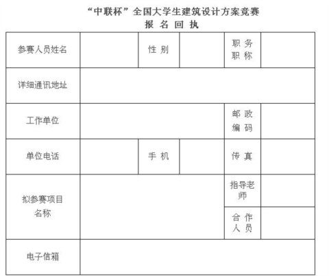 參賽者必須填寫參賽報名回執表(附后),報名后應按時提交參賽方案。本次競賽免交報名費。