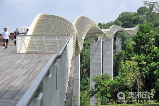 ![]() ![]() ![]() 如果你喜歡我們對紐約高架公園的報道,那直落布蘭雅公園中的高空走廊會把你帶向一個更高的高度。該公園位于新加坡,公園里的那個飛越式的走道就是你在電影里看到的連接各個山洞的古代繩索橋的現代懷舊版,從這里你可以看到樹頂部的風景,這種體驗可是非常難得的,因為在以前只有猴子才能看到。這些懸在空中的走道還有橋梁,并不是左右搖晃的。事實上,它們設計優雅并且構造精確,即使你在公園的最高處,你也不會有暈眩的感覺。 直落布蘭雅的景色非常壯觀,是因為它在建造過程中卻本著尊重自然的態度。其它的公園通過砍伐樹木來制造公共空間,并將瀕臨滅絕的動物的家搬到這里。直落布蘭雅的設計完全保留了自然景觀,所有設施都建造在景觀周圍。此外,這些網狀的道路形成了一個開放的空間。亨得申波浪橋(Henderson Waves)(新加坡最高的步行天橋)以及亞歷山大拱橋(Alexandra Arch)都是最讓人驚嘆的部分。每晚,亞歷山大拱橋上都閃耀各種讓人眩目的顏色---不停變化的LED燈。 在這個枝葉繁盛的樹頂天堂里,你可以看到生活在這里的各種的野生動物,例如,松鼠、太陽鳥、鴿子、蜥蜴以及白鹮。事實上,研究者經常到附近的麥里芝吊橋(HSBC Treetop Walk)去研究雨林樹冠,但是如果沒有這個獨特的空中建筑物,那里也根本不容易進入。 在自然中,你也可以非常容易的看到新加坡都市的熙攘與喧囂,游客在公園的許多地方都可以看到新加坡全景,這也是在大多數自然保護區中沒有的獨特景觀。通過將建筑融入到綠色空間和喧囂的城市中,而不是將其在兩者中分開,直落布蘭雅山公園向我們展示了一個成功的將自然與建筑結合得真實例子。
