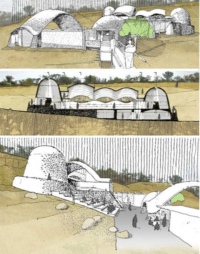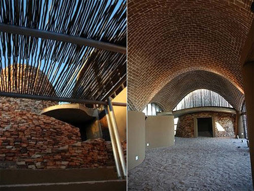 南非建筑師彼得-里奇(Peter Rich)設計的馬篷古布韋展覽中心(Mapungubwe Interpretation Centre)在11月6日舉行的2009世界建筑節文化競賽文化單元榮獲“年度最佳建筑”大獎。 南非馬篷古布韋展覽中心位于林波波河(Limpopo)和沙謝河(Shashe)兩河流域的交匯之處,是為收藏和展示南非史前文物而設計,其用途和建造方式都是對于該地區歷史文化的保護——收藏的史前文化將會為游客們展示本地生態和歷史,而建筑本身采用的圓頂構成元素,特別采用堅固土磁磚材質,融匯當地人民的設計智慧和勞動參與,并將在當地村莊里延用推廣這些建筑方法。競賽評委對該項目原始文化和手工智慧大加贊賞,同時,該中心的大多數建造材料也來源于當地,與周圍自然環境極好的融合在一起,其可持續性和環保性也深受評委青睞。 林波波河和沙謝河交匯處曾經是南部非洲最大王國遺跡所在地,馬篷古布韋國家公園將這里的自然環境與津巴布韋古代貿易文化聯系結合起來,而馬篷古布韋展覽中心就位于國家公園內的一處平頂山上。這座平頂山是因林波波河由流入大西洋改道流入印度洋而形成的,其附近約1公里處的另一座“姊妹”平頂山上還坐落著文化中心紀念館。 該區域的復雜景觀給馬篷古布韋展覽中心提供了無窮靈感,同時,也提供了大量的建筑材料。這使得該建筑與周遭地理環境完美融合。馬篷古布韋展覽中心的屋頂主要采用等邊三角形的結構,使其建筑外觀輪廓呈現出獨特的造型,建筑的外立面仿佛是馬篷古布韋山上的巖石雕刻而成。展覽中心內部則像是兩個中空的石冢,喚起了人們對于南非文化的記憶。 除了在建筑設計上展示了視覺魅力,同時這還是一個扶貧項目,完全利用生態的方法和材料建成。建筑內的照明大部分來自于大門和走廊的自然光,南面強光的地方利用土生土長的樹枝“網絡”來達到遮光避暑的目的。內部的瓦片都采用當地的泥土燒制。太陽光經過有色花玻璃的過濾,照射在池塘上用來冷卻室內空氣。整條走廊曲曲折折,高高低低,參觀者可以選擇斜坡路或是樓梯,走到上層俯瞰下面的展品。所以,從外部看,連續的三角形的拱形屋頂就像波浪一般,在大自然背景下起起伏伏。 該項目不僅僅是用來介紹和展示該地區古代和近代歷史文化的,其作用還在于喚醒當地對生態環境保護的薄弱意識。當地很多失業人員都參與了該中心的建設工作,他們見識到了土燒瓷磚的堅固性,并掌握了拱頂建筑的搭建技巧。這方面的建筑知識現在已經開始被當地文化所接受,當地的泥瓦匠們開始利用學到的新知識在附近村莊建造新的可持續型房屋。 馬篷古布韋展覽中心的設計者彼得-里奇在獲獎感言中表示:“我會繼續這樣的工作,繼續謀求為弱勢社群服務的途徑,因為這是他們應得的。” 該中心不僅將為世人展示當地史前的故事,其本身也將成為該地區文化的一部分,在當地共生發展與自然遺產文化的史冊上留下重要的一筆。