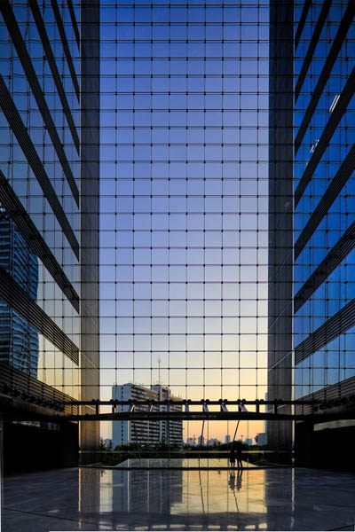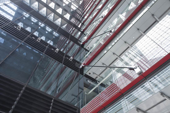 建筑由一個通天高的中庭連接兩個矩形辦公樓,在中庭的兩側均有一面大型的66X230英尺的拉索幕墻。一座塔樓專門為鉆石交易中心成員服務并且意予為成員提供了從地下停車區域到樓上辦公的直接的安全垂直交通。相鄰的塔樓為其他住戶提供服務,通過中庭的一個開放式電梯廳出入。