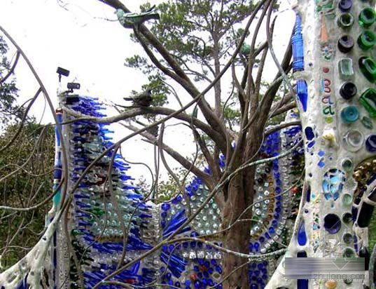玻璃瓶和建筑看起來(lái)并不搭配,但是你接下來(lái)看到的可能就會(huì)讓你吃驚。Minnie Evans玻璃瓶教堂是Vmwf(Virginia Wright-Frierson)在2004年建立起來(lái),位于北卡羅來(lái)納州威爾明頓市的艾爾萊花園。這是一個(gè)非常獨(dú)特的教堂,它用的主要材料是玻璃瓶,但是這些玻璃瓶組成建筑卻亦常漂亮。教堂中間是一棵樹的雕塑,樹上有鳥的造型,看起來(lái)栩栩如生。