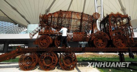 這是3月28日在上海世博園區拍攝的由廢鐵組成的大型卡車雕塑。近日,各式世博藝術雕塑陸續亮相上海世博園區,迎接4月下旬即將舉行的試運營。