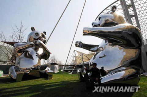 這是3月28日在上海世博園區拍攝的大型熊貓雕塑。近日,各式世博藝術雕塑陸續亮相上海世博園區,迎接4月下旬即將舉行的試運營。