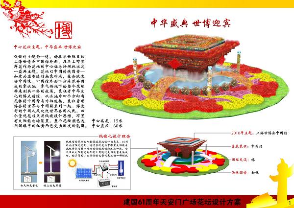 日前,一年一度的2010年天安門廣場花壇創(chuàng)意設(shè)計(jì)競賽作品征集結(jié)束,北京林業(yè)大學(xué)園林學(xué)院共有11支學(xué)生團(tuán)隊(duì)推出12個(gè)創(chuàng)意設(shè)計(jì)方案。 本次天安門廣場花壇創(chuàng)意設(shè)計(jì)競賽以天安門廣場中心花壇(直徑60米)及兩側(cè)畫卷花壇(各寬30米、長160米)為設(shè)計(jì)場地,設(shè)計(jì)要素包括(一)2010年——2011年國家熱點(diǎn)大事:如今年兩會(huì)的重要精神、低碳經(jīng)濟(jì)、2010上海世博會(huì)、2011年西安的世園會(huì)等;(二)新中國成立61周年以來偉大祖國各行各業(yè)所取得的輝煌成就;(三)中華民族五千年文明的神州大地的名山大川或經(jīng)典景點(diǎn);(四)國家繁榮昌盛、民族大團(tuán)結(jié)、人民安居樂業(yè),和諧社會(huì)的大好局面面;(五)大國首都謀劃未來,建設(shè)世界城市等五個(gè)方面。