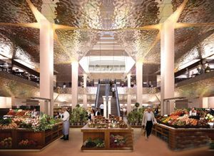 這座7層高的百貨公司用大理石做覆層,是由當地的事務所Project Meganom設計的。大型的中庭切割了各零售樓層,而LDS事務所設計的食品廊位于第五層,屋頂還有一座咖啡館。 該事務所主管保羅·桑德蘭茲(Paul Sandilands)表示,這座建筑有著很復雜的折疊型外觀,因此天花板的設計不能用標準的解決方案,而是要將所有的幾何形狀打破。LSD設計了一座巨大的“反光器”,這是一個建筑上的方法而不是內部設計方法。鋼框從混凝土墻面上懸垂下來,并支撐著德國EXYD公司生產的不銹鋼板材。這些帶紋理的反射板材面積達2300平方米,將忙碌的景象投射到商店的其他部分,就像水中的波紋一樣。 這個工程目前已經在施工當中,預計今年10月能建成。