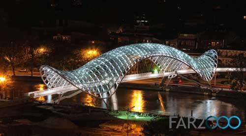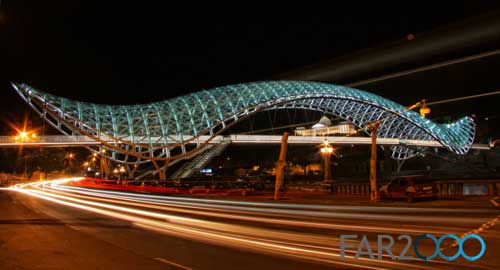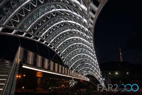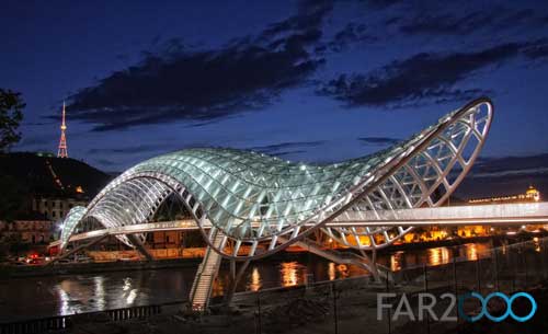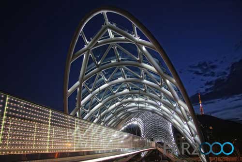 跨越第比利斯Mtkvari河的新步行橋“和平橋”是由意大利建筑師Michel De Lucchi和法國照明設計師Philippe Martinaud設計的。這座用玻璃和鐵建造的步行橋連接了第比利斯老區和新區,并設有一個150米高的頂棚。5月6日,步行橋正式開放,并成為第比利斯的一個現代設計地標。 從橋上可以看到Metekhi教堂和Narikala要塞以及Baratashivili橋和總統住所等。它安裝了一個交互式的燈光顯示系統,包括3萬個LED燈和240個傳感器,每小時根據特殊的信號沿著橋梁的兩個護墻依次閃爍,很像是莫爾斯電碼,象征著人體的化學元素以及人類的生命與和平。這座閃閃發亮的橋梁以其海洋生物般的外形匍匐在河上,具有近乎生物學的外觀。 在開放儀式上,格魯吉亞總統Mikheil Saakashvili表示,這座橋梁是格魯吉亞從過去走向未來的標志,是歷史與現代之間的橋梁,同時體現出政府管理的特點:透明、靈活、果斷和現代性。