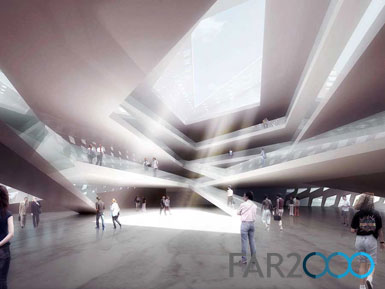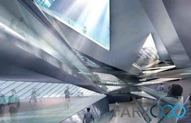在山西省大同市舉辦的兩個雙子塔設計競賽中,PlasmaStudio贏得了其中一個競賽的一等獎。該項目的房屋面積為7萬平方米,其中一座大廈是飯店,另一座是辦公樓。 雙子塔主要用作商業活動,尤其是底下的四層。對稱的鏡面建筑外形體現出中國的“陰陽”排列,螺旋式的環繞系統將兩座大廈的底層交織到一起。 從基座生成的空間和連接線構成了連續的變形環狀,并由此分岔形成了兩座大廈,以螺旋式的運動軌跡達到屋頂。 大廈的內部采用低能耗的通風設計,并隨著一年四季加以變化,冬季可以存儲太陽能,夏季則構成了風塔。地源熱泵帶動的制冷和取暖系統減少了能量的消耗。此外,立面的設計能優化光照和內部溫度,被動節能系統可根據內部活動的類型進行不斷的變化。