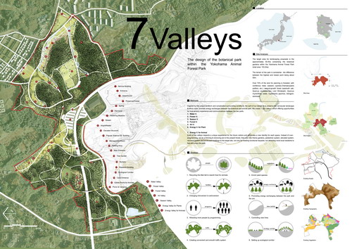 設計地塊為日本橫濱動植物公園的植物公園,地處橫濱市七大綠心的中心位置。現狀地形以丘陵為主,涵蓋兩個山脊和三個山谷,地表植被覆蓋率達70%以上。 受場地地形和周邊環境的啟發,我們將充分尊重場地精神和保留景觀遺產作為設計的出發點,通過設計7條山林谷地,豐富場地景觀,并以此開啟動、植物公園之間的能量交流。這7條山林谷地分別是:水之谷、花之谷、季相之谷、森林之谷、藝術之谷、植物能量谷和動物能量谷。每一條谷地的設計都考慮了場地現狀肌理,并體現了景觀體驗和地塊識別的唯一性。 在此基礎上,我們將整個公園中的植物、動物和人看作是一個有機的生命體,并為之建立了維持自身運行的五套系統:植物更新系統、落葉回收系統、能量交換系統、高架交通系統和游人活動系統。植物系統方面,設計遵循了最少干預的原則,設置植物專類園,豐富植物種類;落葉回收系統方面,設計倡導市民參與維護,建立小型回收點、電瓶車回收點和大型運輸車回收點三層回收系統,以便收集動物食材;能量交換系統則是直接通過苗圃的形式,為動植物公園進行苗木補充和動物飼料補給;高架交通系統是景觀構筑物和游步道的結合,從而串聯東西兩個地塊,并疏導復雜的交通;而游人活動系統是通過活動策劃,為所有可發生活動提供場地條件。 通過7條景觀山谷和五套景觀系統的相互交織,我們的設計目標是:市民參與下的公園自我維護;公園的外向性轉變;游人和活動項目的不斷增加;景觀體驗的多元化;便捷的交通;豐富的植物種類;動植物之間形成能量交流,最終達到人與自然的和諧共處。