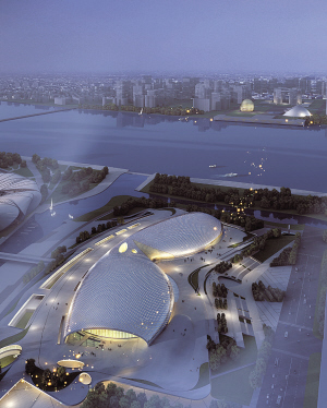 體育游泳館 杭州奧體博覽城項目,位于城市中軸的錢塘江南岸,濱江區(qū)和蕭山區(qū)兩區(qū)分界的七甲河兩側(cè),與錢江新城核心區(qū)隔江相望、南北呼應(yīng)。規(guī)劃中的地鐵6號線將橫穿整個奧體博覽城,錢江二橋、錢江三橋、慶春路過江隧道、青年路隧道(規(guī)劃)、地鐵一號線、地鐵二號線聯(lián)結(jié)兩岸,快速通達(dá)主城。奧體博覽城規(guī)劃總面積583.89公頃。其中,核心區(qū)面積154.37公頃,核心區(qū)共安排12個項目,分別是主體育場、體育游泳館、國際博覽中心、綜合訓(xùn)練館、七甲船閘改建、七甲河整治(含跨河橋梁)、濱江一路、沿江配套設(shè)施及車庫、錢江二路(濱盛路)下穿隧道、雙塔、地鐵奧體站上蓋物業(yè)、地鐵博覽站上蓋物業(yè)。以上項目總投資約271.8億元,核心區(qū)總建筑面積272萬平方米。 杭州奧體博覽城建設(shè),是事關(guān)杭州經(jīng)濟(jì)社會發(fā)展的重大項目之一,是提高杭州市民生活品質(zhì)的“民心工程”,是杭州發(fā)展現(xiàn)代服務(wù)業(yè)的“競爭力工程”,是加快濱江新城和錢江世紀(jì)城建設(shè)的“先導(dǎo)性工程”。建設(shè)杭州奧體博覽城,對于提高杭州市民的體育生活品質(zhì)、文化生活品質(zhì)、經(jīng)濟(jì)生活品質(zhì)、環(huán)境生活品質(zhì)都具有重大意義。 建設(shè)奧體博覽城,是市委、市政府在認(rèn)真調(diào)研基礎(chǔ)上慎重作出的重大決策,是杭州城市建設(shè)的重要組成部分,充分體現(xiàn)了“沿江開發(fā)、跨江發(fā)展”戰(zhàn)略。奧體博覽城作為杭州從“西湖時代”邁向“錢塘江時代”的標(biāo)志性工程,始終堅持高標(biāo)準(zhǔn),嚴(yán)要求,按照打造“世紀(jì)精品,傳世之作”,“追求完美、不留遺憾”的要求,扎實推進(jìn)奧體博覽城建設(shè),努力把奧體博覽城建設(shè)成基礎(chǔ)設(shè)施比較完備、功能比較完善、帶動輻射力比較強(qiáng)的新城和大型城市綜合體。 奧體博覽城的選址,不僅與市民中心處于一條軸線,而且與北岸錢江新城核心區(qū)“日月同輝”建筑群遙相呼應(yīng)、相得益彰,勾畫了“一江兩岸、雙城核心”的城市發(fā)展新藍(lán)圖,實現(xiàn)了“中間”突破、“惠及”兩翼(既惠及濱江科技新城,又惠及錢江世紀(jì)城)的格局。杭州奧體博覽城建成后,國際博覽中心與奧體中心聯(lián)合布局,可以更好地實現(xiàn)通盤考慮、功能互補(bǔ)、優(yōu)勢疊加,更好地承辦洲際性、全國性的大型體育賽事和會展活動,提高場館的利用率。同時,杭州市群眾文化中心、非物質(zhì)遺產(chǎn)展示中心、中國印學(xué)博物館新館落戶在奧體博覽城核心區(qū)內(nèi),也將進(jìn)一步豐富“奧博綜合體”內(nèi)涵,真正將奧體博覽城最終打造成為以體育、文化、博覽為特色,集觀光、休閑、度假、購物、美食、 演藝等功能于一體的“世紀(jì)精品、傳世之作”、錢塘江南岸的“新地標(biāo)”。 主體育場:主體育場區(qū)規(guī)劃建筑面積53.58萬平方米,設(shè)有80000座主體育場和10000座網(wǎng)球決賽場(網(wǎng)球場共有25片)。主體育場首層、地下一層設(shè)有杭州市群眾文化活動中心、杭州市非物質(zhì)遺產(chǎn)保護(hù)中心、中國印學(xué)博物館新館三大公益文化設(shè)施,以達(dá)到聚人氣,提高場館利用率的目標(biāo)。建成后的主體育場區(qū)除滿足舉辦洲際性、全國性綜合運(yùn)動會及國際田徑、足球、網(wǎng)球比賽要求,賽后可開展群眾性體育、健身活動,同時為周邊提供娛樂、購物、休閑、旅游、商務(wù)等空間。項目已于2009年12月26日動工建設(shè)。 國際博覽中心:國際博覽中心規(guī)劃建筑面積84萬平方米,設(shè)有展覽中心、會議中心、上蓋物業(yè)、屋頂花園(城市客廳)、地下車庫(地下商業(yè))五大功能區(qū)。展覽中心設(shè)計國際標(biāo)準(zhǔn)展位7500個(其中1000個為室外展位);會議中心能滿足舉辦APEC、達(dá)沃斯等高規(guī)格的國際會議;規(guī)模6萬平方米的屋頂花園結(jié)合城市客廳既能滿足高規(guī)格接見、高標(biāo)準(zhǔn)宴會、高檔次精品展的需要,城市客廳與錢塘江對岸的“城市陽臺”遙相呼應(yīng),形成一個新的城市亮點。項目已于2009年10月28日動工建設(shè)。 體育游泳館:體育游泳館建筑面積39.70萬平方米,觀眾席容量分別設(shè)計為18000座和6000座。體育館內(nèi)能進(jìn)行籃球、羽毛球、排球、乒乓球、手球、競技體操、拳擊、武術(shù)、室內(nèi)足球等比賽。而游泳館是集游泳、跳水比賽為一體的專業(yè)運(yùn)動場館。獨(dú)特的流線型造型,結(jié)合雙層銀白色金屬屋面和燈光設(shè)計,形成世界上最大的兩館連接體非線性體量,其必將成為未來杭州的新地標(biāo)。 綜合訓(xùn)練館:代表杭州良渚文化玉琮造型的綜合訓(xùn)練館,建筑面積18萬平方米,功能以體育賽事為主,結(jié)合體育訓(xùn)練、醫(yī)療、科研、新聞中心和后勤服務(wù)功能。在合理滿足運(yùn)動員訓(xùn)練同時,充分考慮群眾性文體活動和臨時會展等的功能要求。 地鐵上蓋物業(yè):奧體博覽城核心區(qū)內(nèi)設(shè)有地鐵博覽站上蓋物業(yè)和地鐵奧體站上蓋物業(yè),為杭州地鐵6號線穿越奧體博覽城的兩個地鐵站上蓋物業(yè),規(guī)劃建筑面積分別為20萬平方米和25萬平方米,功能設