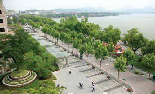 威廉·卡拉威:曾經(jīng)有一位杭州的房地產(chǎn)發(fā)展商告訴我,許多中國人對自己的設(shè)計品位并不自信。他認為其部分原因是:盡管在歷史上中國曾經(jīng)在藝術(shù)和設(shè)計方面是佼佼者(甚至中國書法也是一門獨特的藝術(shù)),但是由于長達近50年的集中控制,藝術(shù)和設(shè)計一直不在優(yōu)先考慮之列。在我們展開中國項目的最初幾年里,客戶常常在回應(yīng)我們所提出的設(shè)計構(gòu)想時表現(xiàn)得比較遲疑。相形于視覺設(shè)計方面,他們關(guān)注的重點更多地集中在設(shè)計的功能性以及工程造價。許多客戶也傾向于非常保守的風格。但是最近幾年這樣的狀況正在逐漸改變。我們的客戶在親眼目睹許多遍及全中國的優(yōu)秀設(shè)計項目之后,他們不僅非常自信于他們所想達到的目標,而且更加積極地把他們的意愿體現(xiàn)到設(shè)計之中。 ![]() 杭州湖濱(SWA供圖) USD:中西方的景觀設(shè)計項目的設(shè)計周期有什么不同?程序上又有哪些變化? 威廉·卡拉威:中國是一個快節(jié)奏的國家。許多客戶急于把事情立即完成。我認為在這種情況下,相對景觀設(shè)計師而言建筑師面臨更大的挑戰(zhàn),因為建筑設(shè)計需要更多的時間來完成從設(shè)計、成圖到建造等一系列工作。對個人而言,我很喜歡這種在中國辦事風風火火的風格,因為在美國一個工程從批準到設(shè)計完成往往要耗費數(shù)年。