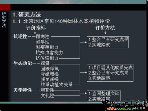 ![]() 如何構建近自然園林植物景觀……? 技術路線 ![]() 第一部分 北京常見園林植物評價 研究內容 ◆ 北京地區常見140種園林木本植物打分、排序; ◆ 北京地區67種園林草本地被植物定性評價。 研究方法 ![]() ![]() ![]()