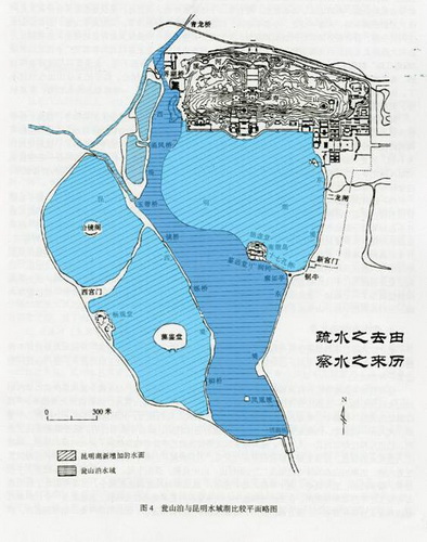 甕山泊與昆明水城湖比較平面圖 清漪園的昆明湖是在甕山泊的基礎上擴大水面形成的。擴展后才使山水相映成趣。龍王廟本是東岸游人集中的焦點,故保留并以十七孔橋連接東堤并以廓如亭和銅牛鎮水。龍王廟自成主島。在筑西堤時南北向劃分兩水面,水中各一島即治鏡閣和藻鑒堂,獨具一格的一池三山因此形成。避暑山莊也是沼澤地開辟的水系,按造園宗旨和總體布局的安排樹立了以"芝徑云堤"為意境的一池三山模式,以仙草靈芝反映仙山。故自萬壑松風和云山勝利順訓鹿坡下到湖面后以一橋相銜仿佛以菌把為生長點,而生出"環碧小島"。 再東回折產生"月色江聲"中島。并向北展出"如意洲"大島。又以山莊地宜獨辟蹊徑的創造出一池三山又一別式。并藉若高原之山區,若江南水鄉之湖區和山湖間的草原區來反映中國地理的版圖特征而反映普天之下莫非王土。 而原為沽澤的圓明園憑借沼澤所宜,循戰國方士鄒衍"履方戴園"之九州說,中國是神州內小九州,外環裨海,裨海以外為大九州即世界他國。所謂"裨海周環為九州者九,大瀛海環其外。"這屬于內得心源的人文范疇,具象考證為《禹貢九州圖》外師造化則師法中國古代大澤--云夢澤匯川為澤,水口皆水景佳處。 最后結合當時宮廷社會生活需要而給九島以景名:九州清晏、鏤云開月、天然圖畫、碧桐書院、慈云普護、上下天光、杏花村館、坦坦蕩蕩、茹古涵今。 借景不僅應用于總體布局,在景點布置和細部處理方面也具有重要理法的地位。如果軍事上"兵不厭詐",那園林就是"景不厭精"了。只有宏觀布局而沒有微觀的布置是不能動人的。微觀景親人,看門道的內容之一,要人們"涉園成趣"、"日涉成趣",每看成趣和流連忘返甚至達到忘機的境界,沒有目寄心期的景物是不可能奏效的。