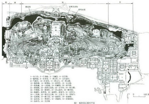 頤和園的后溪河是清漪園開辟的人工水系。從實用功能講要輸水給圓明園和北邊的稻田。從造景而言彌補了萬壽山長于高遠、平遠而缺少深遠之弊。鑿溪河之土主要堆在北岸作自然式土山與萬壽山北面山麓組成兩山夾水的結體。水的線形首先與河床基質、山洪瀉水口等自然環境取得協調,使設計地形得以穩定地發展。通過溪河自南而北再自西而東,把前山乏于深遠而長于面闊的關系,在后山轉變為以前山之面闊為后山的進深,加以極盡自然變化、寬窄、曲直組合多至,深歷其境真有"山窮水盡疑無路,柳暗花明又一村"的詩意。 水自南往北轉東,河面落北凹成灣。到北山西坡集中排山洪的桃花溝將河面放到最寬而呈喇叭形水口,充分地接受山洪而使其消力。欲揚先抑,擴大前面的水面壓縮到兩米多,岸上作關隘,因關隘是扼咽控要的,通過后驟然放大,對比強烈。下一段水面的基質是巖石,難于開鑿,故寬度有限,只作曲尺型小變化而用作買賣街。然后再用不同形式接納"寅輝"山溝下來的水,在山谷中做了些山石處理,洞、瀑隨遇而安,雨后自成水景,疊水、山溪、削壁、懸瀑,無雨時也"似有深意"。《園冶》所謂"斜飛堞雉"和 "參差半壁大癡"得以盡現。 水面并不單擴大,而在近水對岸作小環島,山洪自然隨島環流而同樣達到消力目的而景物卻是不同面目了。再東北岸的小"盲腸"水港是為作小船塢和做墻外農田灌溉用的。溪河東端一分為二。南入諧趣園鑿石安暗閘橋"玉琴峽"入諧趣園。玉琴者美石無琴弦也。并不生硬寄暢園之八音澗,自成石渠回落,松蔭籘影,有"蘿月"和玉琴峽橫鐫石刻,渾厚、沉實而有別于江南之玲瓏剔透。北支引入霽情軒,利用天然石坡滑水,一簡一繁,相映成趣。 作為圓明園的屬園,清漪園辟東宮門為主宮門。仁壽殿南有元代功臣耶律楚材墓,乾隆為了有所間隔互不相攏,筑土山一卷相隔,土山又是宮苑之間的障景,仁壽殿面小山拱伏,山林蔭翳,谷道隨山起伏回轉,出谷則見昆明湖空曠清新,由奧觀轉入曠觀。但在岸邊觀萬壽山佛香閣似感視角太偏不得盡美。南水中就露出知春亭的島、橋、亭和樹石的組合。古圖上稱"智春亭",古文知同智。居島觀佛香閣是近覷的最佳視點,智春亭的意境并不是"池中水暖鴨先知",而是智者欣賞美景駐足的地方,充分體現了設計者的才智。 玉瀾堂第二進的夕家樓本是西廂房 ,東西曬的所在本是不利的。設計者巧借陶淵明詩有"山氣日夕佳,飛鳥相與還"之句,東掇房山石山谷,種植濃蔭大喬木,將西廂房強調為樓玉立湖岸,先造境,再從境中造景,"景以境出",有景聯稱:隔葉夜鶯芷谷底,唼花幼雛聚塘坳。竟轉劣勢為優質,詩情畫意,在于發現和發揮了居萬壽山東麓之異宜。 后湖北岸有小石坊對著萬壽山北面西端,居下仰上,額題"望云",對岸山腰起鉤連搭卷棚歇山建筑名,其附屬建筑名"袖云"。 西上到近山頂有清可軒壓陣,其旁建筑曰"仃云"。這是從山麓、通過山腰到山頂的一系列建筑,以云為名,而以仰、袖、仃的三個層次反映和夸張地表達了高下的起伏。清可軒為乾隆在清漪園最愛之所,從問名到因山構室都非常清雅高潔,值得深入捉摸。 總之,北京的名園名實相符,何以成名是很客觀的,其中包涵了許多中國傳統園林藝術的理論和方法,中心理論是借景,我們要繼承和發展,再好也不夠用,時代在永無止境的發展,我們必須順應時代發展傳統,繼往開來,與時俱進。
