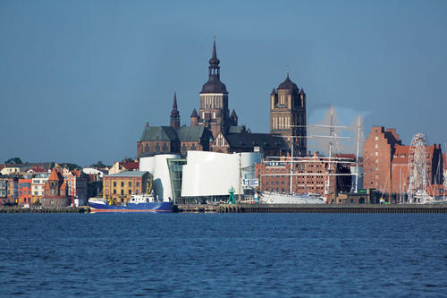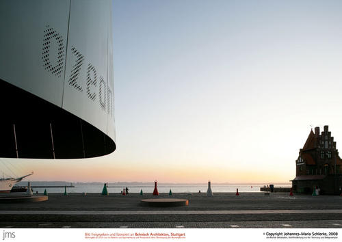 遠看“海洋博物館”。 在筆者訪問斯圖加特之后幾天,史蒂芬·貝尼奇的建筑事務所的一個年輕的建筑師埃爾克·賴克在柏林與筆者結識,然后驅車去施特拉爾松,參現“海洋博物館”——這個建筑事務所在進行的最新的工程。施特拉爾松由于有中世紀的古城和與海洋聯系的文化,在2002年被命名為“世界遺產“。 施特拉爾松希望從附近的呂根島吸引游客參觀它的古跡、著名的魚類加工廠和引人入勝的“海洋博物館”。