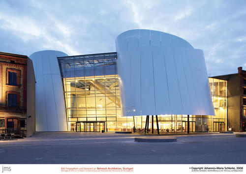 施特拉爾松的“海洋博物館”正面。 史蒂芬·貝尼奇的早期作品——例如位于斯圖加特的Landesgirokasse Bank銀行管理大樓和位于荷蘭瓦赫寧根的歐盟項目“造林與自然研究所”(Institute for Forestry and Nature Research),在一個標準的預算內,使用預制構件和低技術、節能技術。這種“綠色戰略”與他的在計劃和功能上強調以人為中心的觀念是分不開的。 功能主義邏輯和環境專門化,導致他與工程師結合,進入設計過程的最早階段,通常使他們合作設計,參與建筑競爭。史蒂芬·貝尼奇的從2005年以來的合作伙伴馬丁·哈斯(Martin Haas)說:“從一開始,我們就試圖在不同的論題上與專家合作。在全部設計過程中,我們有能源顧問,我們在一起尋求最好的規劃、布局和照明方案。”
