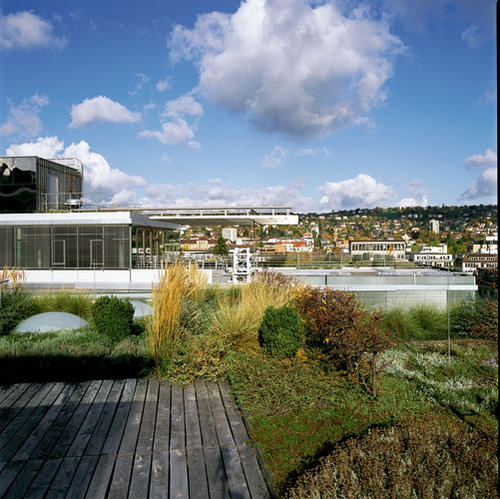 Landesgirokasse Bank銀行管理大樓的“綠色屋頂”。 與實驗室或辦公樓比較,博物館的功能要求與光線有關,但水族館有它們自己的設計要求。在養魚缸里的大量的水,必須被處理過。要求有大規模的壓縮機、冷卻器、水泵和過濾系統,這些設備都隱藏養魚缺的后面。 為了避免水中海藻生長和創造一個更真實的體驗,大多數“現場陳列室”都沒有自然光線。于是,設計師設計了一種循環路線,通過讓參觀者通過陽光明媚的中庭,使他們周期性地消除黑暗。
