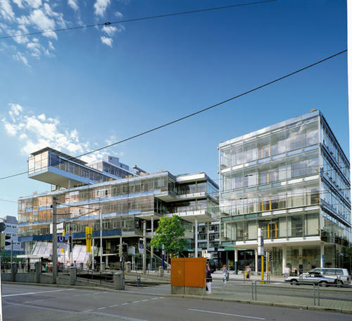 史蒂芬·貝尼奇建筑事務所設計的位于德國漢諾威的北德意志銀行大廈。 為了節約加熱和冷卻的能源,這幢建筑物使用了一種“平板冷卻”(slab-cooling)系統。這個系統是史蒂芬·貝尼奇為另一個項目開發的,并且現在是德國“綠色建筑”的標準設置。在這個系統中,地下水被泵入混凝土板的管道,不僅充當熱質,而且是一種地熱加熱和冷卻裝置。 近些年,史蒂芬·貝尼奇批評“美國綠色建筑委員會”使用與能源消耗沒有關系的“點值”(point values)計算環境品質的方法。德國的規則是以性能為基礎,詳細列出最小量的熱量保存和最大量的能源使用(隨建筑類型而定)數據。運用公式計算太陽能收集、通風方法、加熱、空調、熱水和內部照明系統。