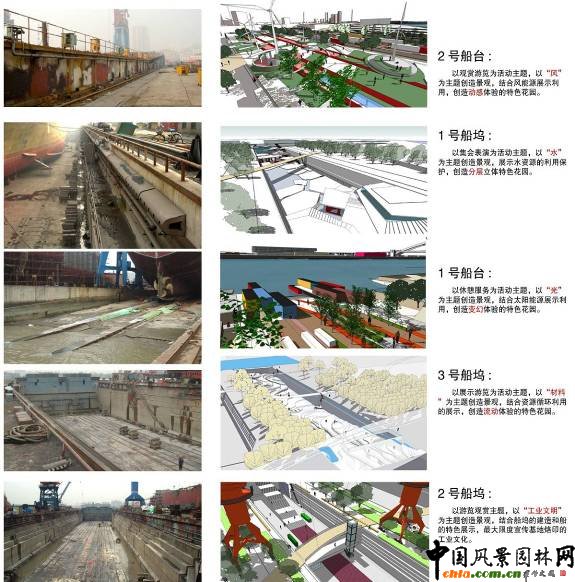 4. 從"制造"走向"創造" 這片土地經歷一百多年的滄桑巨變,這里曾今是中國的"第一工廠"。從封建社會到世界強國,這片土地承載著太多的希望和夢想。昨天在世界強國的壓迫下創辦江南機器制造局,用"制造"支撐起中國圖強的脊梁,今天在世界的矚目下用"2010"世博的創造來演繹我們富足的翅膀。我們用身體貼近這片土地,感受它華麗的轉身,用世博的舞臺來演繹一百多年前創辦這片場地之初國人的 "自強"和"求富"夢。設計從"中國制造"到"中國創造"演奏著這片土地神奇的變遷。設計方案提出了從"制造到創造"的設計概念,用此概念為線索敘事性的展開了這個曲折的故事。 ![]() 圖5 江南廣場效果圖2 5.1 制造:江南造船廠(江南制造局)是近現代中國制造業的先行 創造:2010世博會是當代中國創造國家新儀態的盛會。 概念節選了基地中兩個極具代表性的歷史活動片斷,用以概括基地的本質屬性和特征。江南造船廠與上海世博會都是中國發展過程中重要的時間節點,分別反映了各自發展階段的歷史背景,代表了各自歷史階段的發展狀況。 江南造船廠,前身為"江南制造局",為中國近代軍事工業的發展做出了重要貢獻,被譽為"中國第一廠",制造了同時也是傳播西方近代科技的重要平臺。 2010世博會期間,世博公園、白蓮涇公園、后灘公園展示對城市人居環境的關注;各場館區展示社會活動發展的成果;而浦西濱江綠地規劃不僅僅是景觀設計,更是借世博會東道主之機,創造一個環境與社會活動相結合的舞臺布景,是展示中國以及全世界的創造性活動的片區,表述持續發展態勢的平臺。 5.2 可持續發展的表征,關注基地變遷的動態過程 制造到創造,是一個發展的過程,是一個動態的過程;對于我們所面臨的這樣一個綠地規劃用地,則轉化為基地變遷的動態發展過程。我們僅僅是在思考這一過程中的一個片斷場景;然而我們必須把它放置在大的社會背景下來考量--浦西濱江綠地規劃必然遵循可持續發展的觀點,不僅僅是歷史文化風貌的延續,也是對場地的資源運用和材料選擇等方面的可持續性思考,也應關注會后的持續利用問題,這與可持續發展這個全球發展的共同話題不謀而合。 可持續發展已被大家所熟知,在此我們不作過多的繁述;我們關注更多的是在這一前提下,如何對基地進行現階段的闡述,也就是如何對待處理世博會期間的基地利用對策;如何才能繼續延續發展基地的自有歷史發展脈絡;如何為世博會后的再次規劃利用提供技術保障和可行性支持。 6. 可持續發展語境下的"中國創造" 制造到創造,提出了物化、文化、技術三個方面的要求。這三個方面可以保障基地遵循持續發展的規律,保障風貌延續,保障歷史文化延續,保障會后的規劃再實施。 6.1 持續發展之物化創造 1) 場地持續利用 整個基地屬于江南造船廠廠區,也是原江南制造局用地。在上海的發展過程中,基地也隨著歷史的變遷扮演著不同的角色,呈現出持續發展的面貌。從荒蕪人煙的河灘到小碼頭,再到近代工業的代表,以及今日的世博會,經歷了若干次的轉型利用。現在,也是世博會區域內唯一的會后仍將歸還用于歷史建筑保護的大型區域;現存有5個船臺船塢,呈垂直于黃浦江方向,因此,整個場地被劃分為若干長方形區域,場地特征鮮明。應保護場地的現狀特征,并在原來的基礎上加以改建利用,而不作過多的顛覆性改造,力求延續原有場地的特征與風貌。 ![]() 圖6 現狀構筑物利用意向 2)構筑設施持續利用 在現狀場地中,現存有大量構筑設施,如船塢船臺、塔吊、軌道、船栓、碼頭、防汛墻、工作平臺等。這些構筑設施代表了江南造船廠的基地活動特征,代表了典型的近代港口工業的特質。設計中把船塢船臺作為重點,一方面修繕保護,恢復原有風貌,追溯歷史,尤其是2#船塢,使其能夠盡可能的被保護下來;另一方面進行改造利用,進行功能轉換,滿足世博會期間的功能需求。這樣,既有利于基地工業文化的延續,有利于基地特征的保存,也有利于會后進行報會規劃的實施。 3)自然資源持續利用 在基地內綠化極少,場地內鋪設有大面積的混凝土地坪,并有大量鋼平臺、鋼制設備,總體上以硬質為主,若徹底改變為一般意義上的城市綠色公園,將面臨極大的工程量和工程難度。因此,我們以保留為主,臨時改造為輔,因地制宜地把基地享有黃浦江豐富的水資源和水景以及現狀的自然資源整合起來,塑造一個特色的適宜的濱水景觀區。我們在設計中充分發揮水資源的優勢,把船塢船臺的特色極力發揮,同時也利用風、太陽、霧、植物以及各種材料,對整個基地的形態進行重新的解釋,在保護原有歷史風貌的前提下,創造新的人文景觀、自然景觀,為世博期間提供優質的公共活動空間。