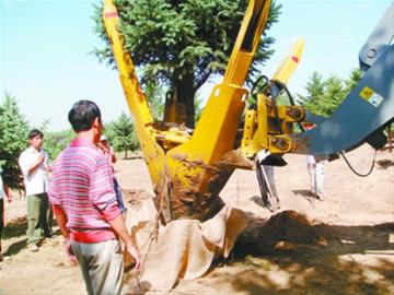 據(jù)介紹,這臺從加拿大引進的苗起挖機價值人民幣50萬元。作業(yè)時,起挖機上的4把鏟刀同時向土壤內(nèi)切割,再將苗木連根拔起。采用該機器作業(yè)不會傷害苗木,并且樹木土球保持完整,大大提高了成活率。整個作業(yè)過程僅需兩三分鐘。