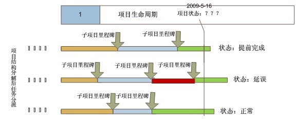 我國項目的一個比較特別情況,是在項目進程中無法清楚知道項目的實際進度和狀態。因為我國技術人員習慣把一個項目的結構分解后,分別交由不同的技術人員負責。這些子項目有本身的生命周期,變成一個項目中有多個子項目同時進行,里程碑是依據各子項目的進程規劃,所以會出現一些子項目可能符合進度要求,一些子項目可能受到延誤,也有可能一些子項目提前完成。導致一個項目的進程中有多種狀態,使項目經理未能準確把握項目進度(見圖一)。