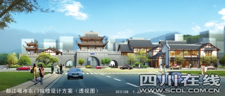 昨日上午,都江堰幸福路與建設路交叉路口已經建起了一圈施工圍欄,東門城樓在這里破土開建。今后,這里將是都江堰歷史城區與現代城區的分界處。都江堰重建辦相關負責人孫凌霞說,東門城樓包括城門及附屬仿古樓群,占地約5900平方米,總建筑面積約3900平方米。城樓城門將橫跨幸福大道,有3個城門洞。中間為主洞,橫跨機動車道,兩側為輔洞,供行人及非機動車通行。