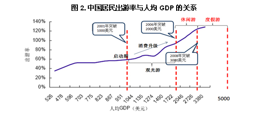 按照一般國際規律,旅游消費升級分為三個階段:人均GDP超過1000美元時,旅游消費進入啟動期;1000-2000美元是觀光游;2000-3000美元休閑游;3000-5000美元則為度假游(如圖2)。