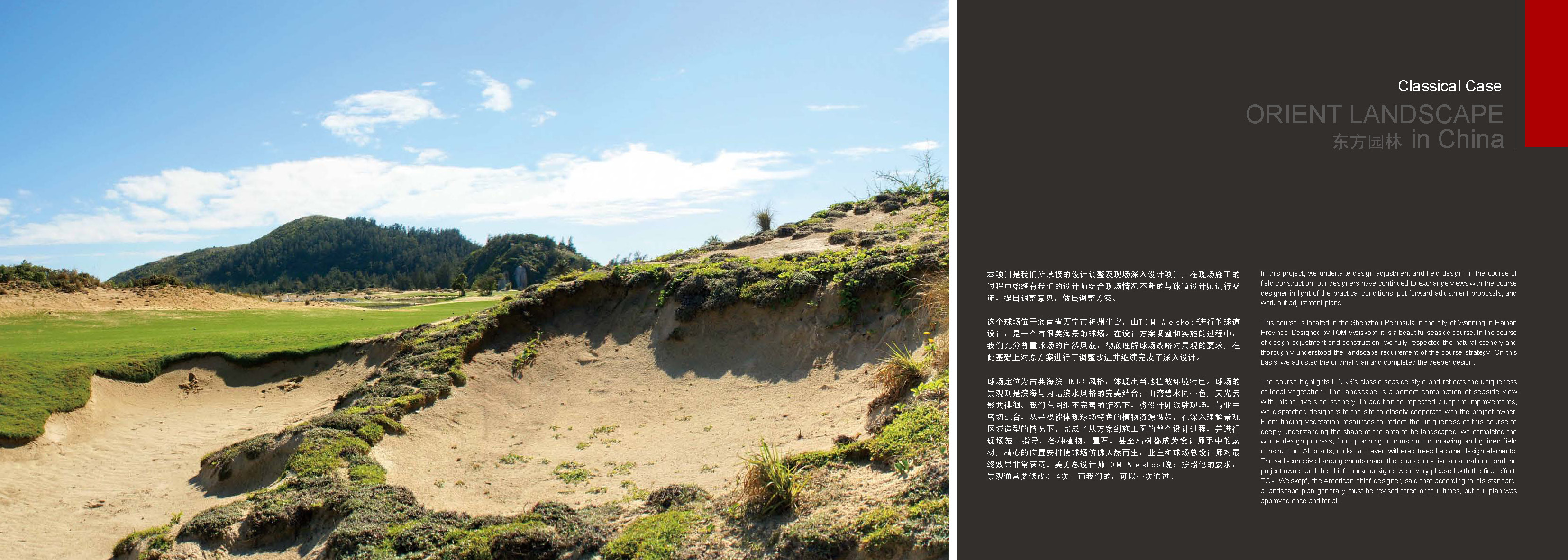 球場定位為古典海濱LINKS風格,體現出當地植被環境特色。球場的景觀則是濱海與內陸濱水風格的完美結合;山灣碧水同一色,天光云影共徘徊。我們在圖紙不完善的情況下,將設計師派駐現場,與業主密切配合,從尋找能體現球場特色的植物資源做起,在深入理解景觀區域造型的情況下,完成了從方案到施工圖的整個設計過程,并進行現場施工指導。各種植物、置石、甚至枯樹都成為設計師手中的素材,精心的位置安排使球場仿佛天然而生,業主和球場總設計師對最終效果非常滿意。美方總設計師TOMWeiskopf說:按照他的要求,景觀通常要修改3~4次,而我們的,可以一次通過。