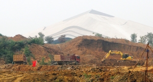 在現(xiàn)場(chǎng)記者看到,工地內(nèi)機(jī)聲隆隆,車來人往。在靠近體育館的一側(cè),幾臺(tái)挖掘機(jī)正伸展巨臂,奮力開挖,取走高山坡上的泥土;而在挖掘機(jī)旁,則是一長(zhǎng)排等候運(yùn)送泥土的車輛,浩浩蕩蕩。