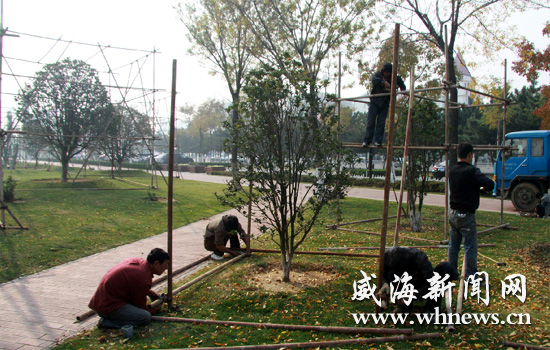 近日,園林工人在幸福公園為一些樹(shù)搭建冬季暖房。立冬后,隨著氣溫不斷下降,威海園林部門及早著手對(duì)市區(qū)各大公園里的樹(shù)木搭建冬季暖房,確保樹(shù)木安全過(guò)冬。