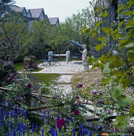 后庭院的休息區(qū)域、彎曲的園路、飽滿艷麗的花徑