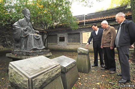 在寧波市天一閣藏書樓創始人范欽石雕像前,中國科學院院士戚正武(右一)、中國工程院院士郁銘芳(右二)等人在閱讀碑文。